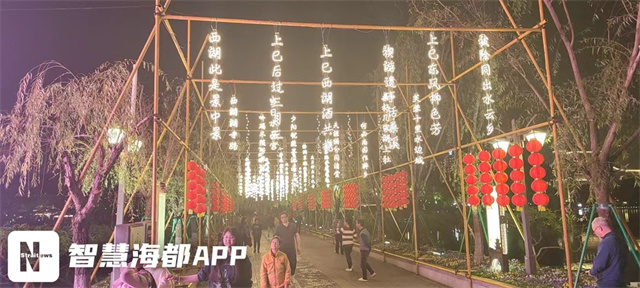 据福州西湖公园管理处相关负责人介绍,今年上巳节,西湖首次在柳堤用诗词灯布置了百米长的“诗词大道”,该条“诗词大道”全长约150米,集纳了130多句与西湖相关的诗句,每一对诗都包含了西湖的景点,让市民在华灯初上后也能感受“一步一景”。