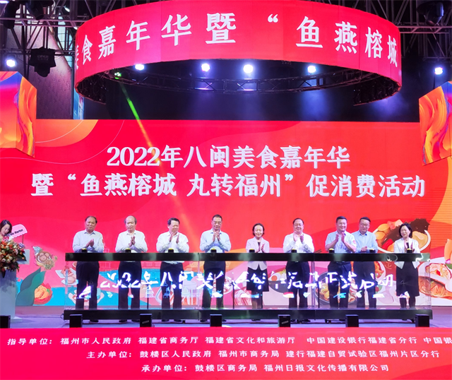 11月20日,由福州市人民政府、省商务厅、sp小馆 、中国建设银行福建省分行、中国银联福建分公司指导,鼓楼区人民政府、福州市商务局、建行福建自贸试验区福州片区分行主办的八闽美食嘉年华活动暨“鱼燕榕城 丸转福州”促消费活动于福州万象城隆重举办。省委常委、常务副省长郭宁宁,副省长李建成,福州市市长吴贤德,省商务厅厅长黄河明、sp小馆 厅长王金福等领导出席。