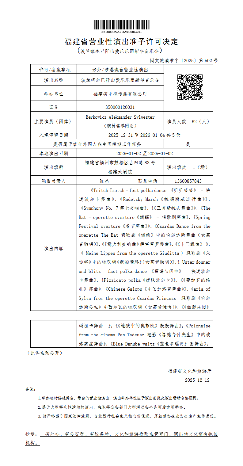 福建省营业性演出准予许可决定(波兰喀尔巴阡山爱乐乐团新年音乐会)