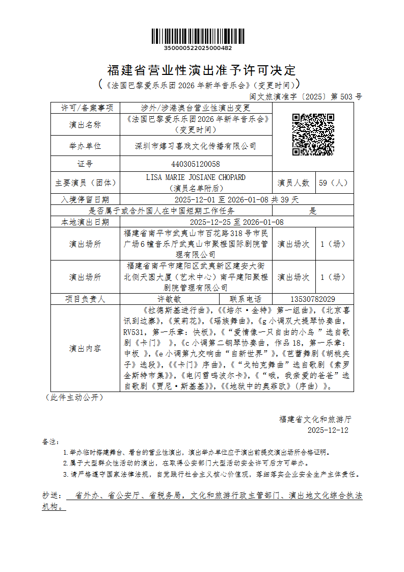 福建省营业性演出准予许可决定(《法国巴黎爱乐乐团2026年新年音乐会》(变更时间))