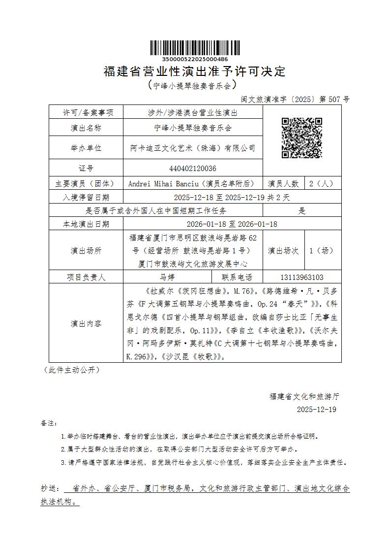 福建省营业性演出准予许可决定(宁峰小提琴独奏音乐会)