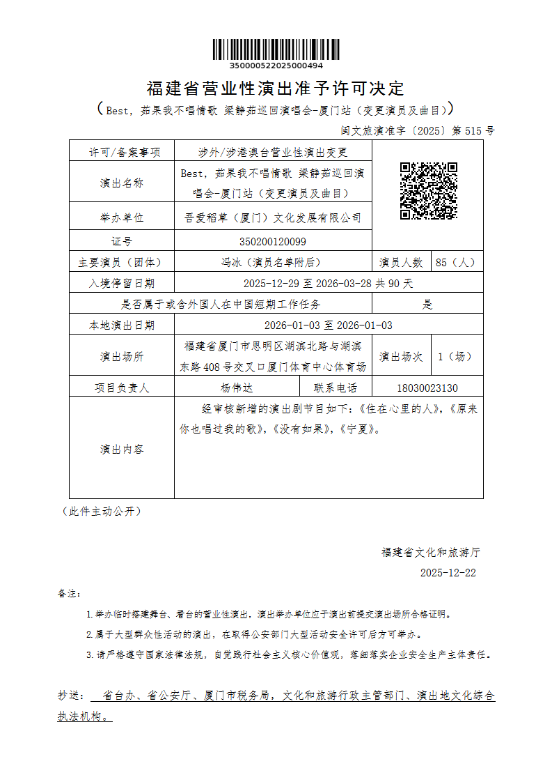 - 内容概述: 福建省营业性演出准予许可决定(Best, 茹果我不唱情歌 梁静茹巡回演唱会-厦门站(变更演员及曲目))